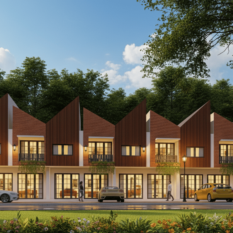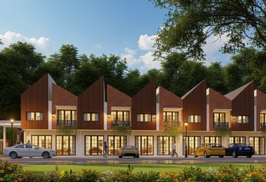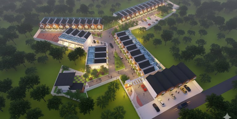 Desain Perumahan lengkap dengan Ruko, kafe, kantor, sekolah, dan masjid dengan konsep arsitektur berkelanjutan.